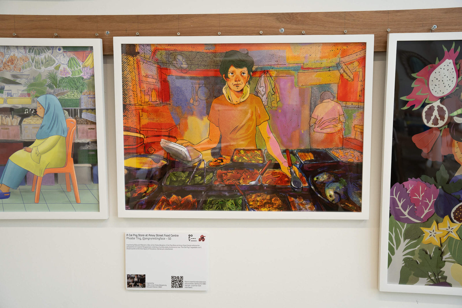 Inspired by Édouard Manet’s A Bar at the Folies-Bergère, A Cai Png Store at Amoy Food Centre reflects the perspective of a typical Singaporean ordering a humble plate of economic rice. The Cai Png ("vegetable rice") shop’s auntie is the hero figure of the piece, intense yet unbothered.