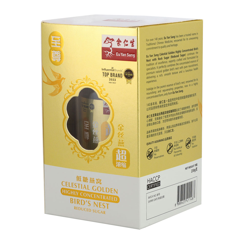 EYS Celestial Golden Highly Concentrated Bird's Nest with Rock Sugar (Reduced Sugar) continues the tradition of excellence, expertly crafted by specialists, combining premium natural golden bird's nest with smooth texture, pure nourishment, and a luxurious health experience.