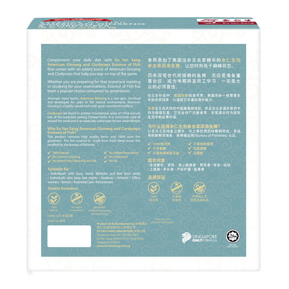 Complement your daily diet with Eu Yan Sang American Ginseng and Cordyceps Essence of Fish that comes with an added boost of American Ginseng and Cordyceps to keep you alert at all times.