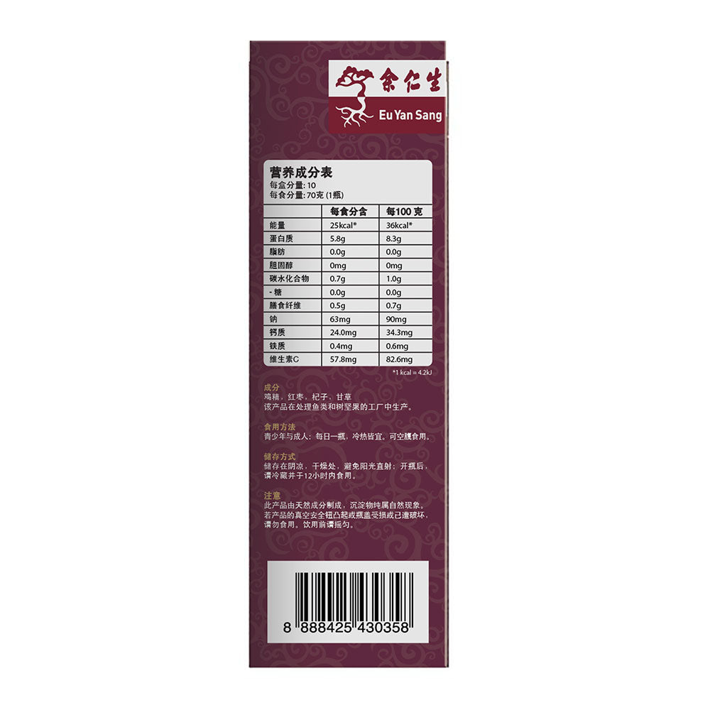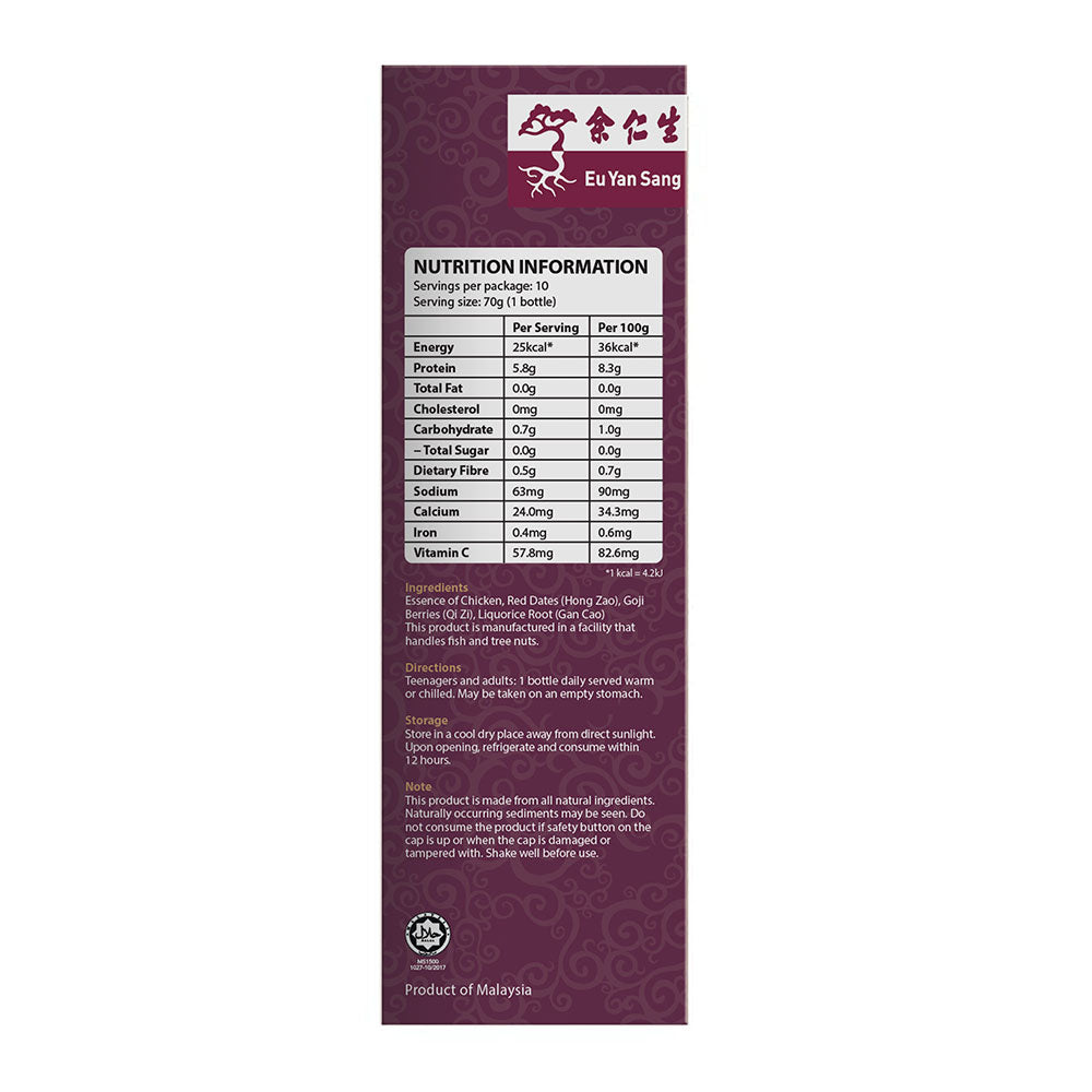 Eu Yan Sang Essence of Chicken with Goji Berries & Red Dates uses modern technology to bring you superb convenience. You are now able to enjoy this full traditional nourishment without the hassle of long hours of cooking and preparation.