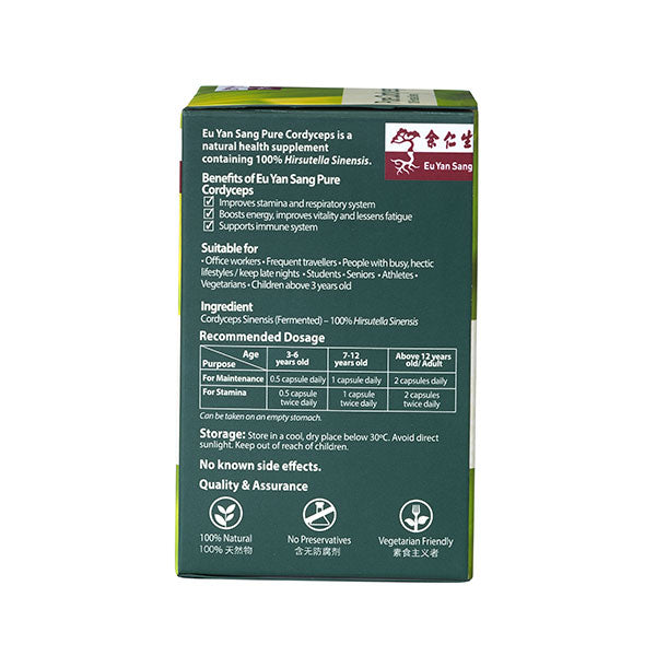 Eu Yan Sang Pure Cordyceps™ (30 capsules) is a natural health supplement that contains the potent benefits of Wild Cordyceps (冬虫夏草).