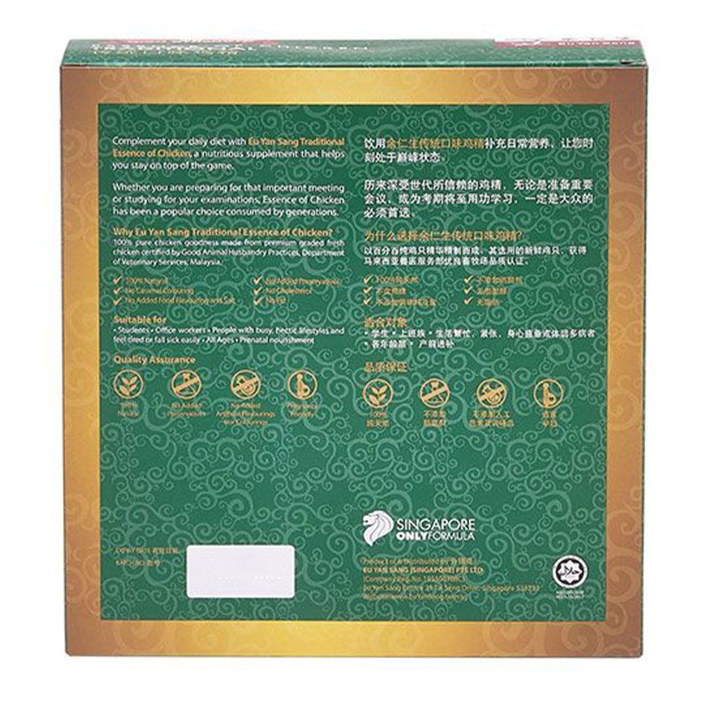 Made from premium graded chicken, only Eu Yan Sang gives you 100% pure Essence of Chicken with no caramel added. It is suitable for consumption by all ages and at all times, and can be taken chilled or warmed everyday.