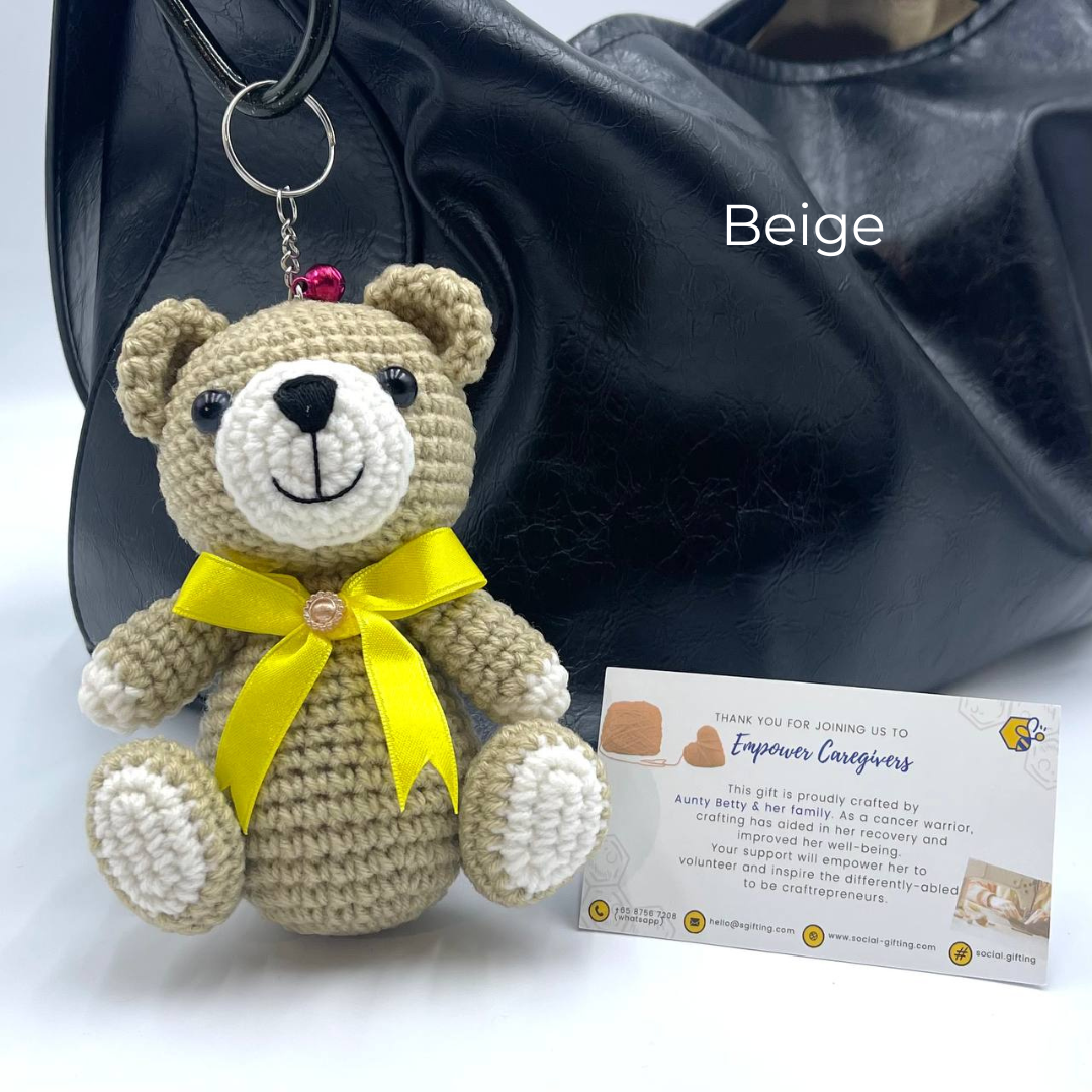 This adorable hand-crocheted bear comes with a ribbon keyring, making it the perfect accessory for your keys or bag. Handcrafted with love, this bear will add a charming touch to your everyday items.
