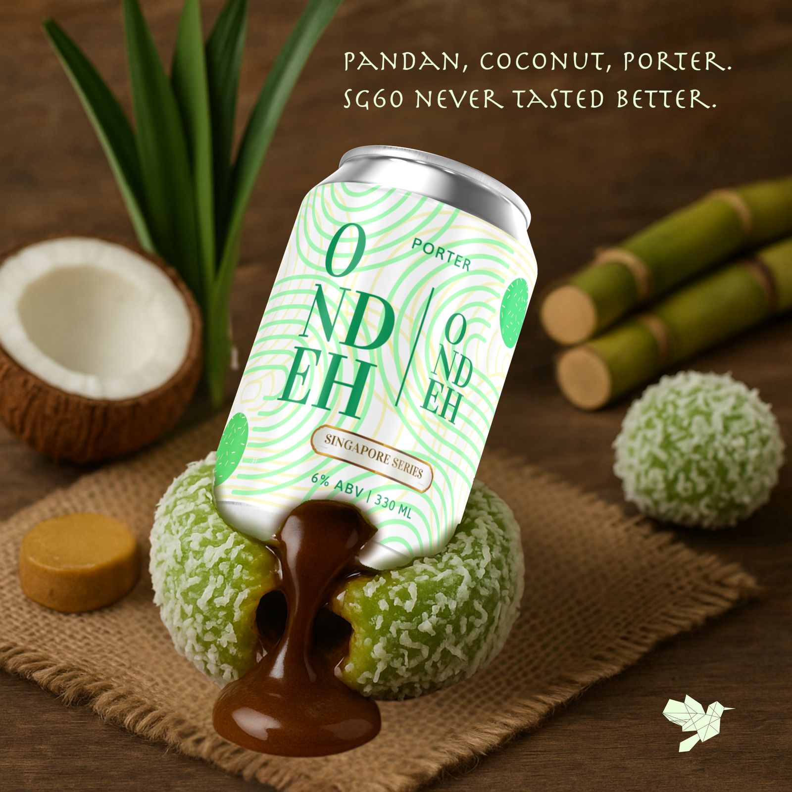 Ondeh-Ondeh Porter pours deep mahogany with a smooth, velvety body — as warm and inviting as Singapore’s evening streets. Inspired by the beloved Southeast Asian treat, this porter blends dark roasted malt with fragrant pandan, toasted coconut, and sticky gula melaka (palm sugar), delivering waves of caramel sweetness, creamy coconut, and subtle tropical spice.