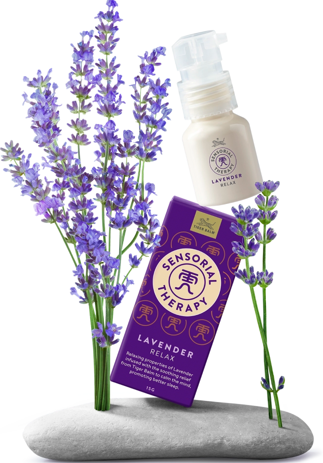 Relaxing properties of Lavender infused with the soothing relief from Tiger Balm to calm the mind, promoting better sleep.
