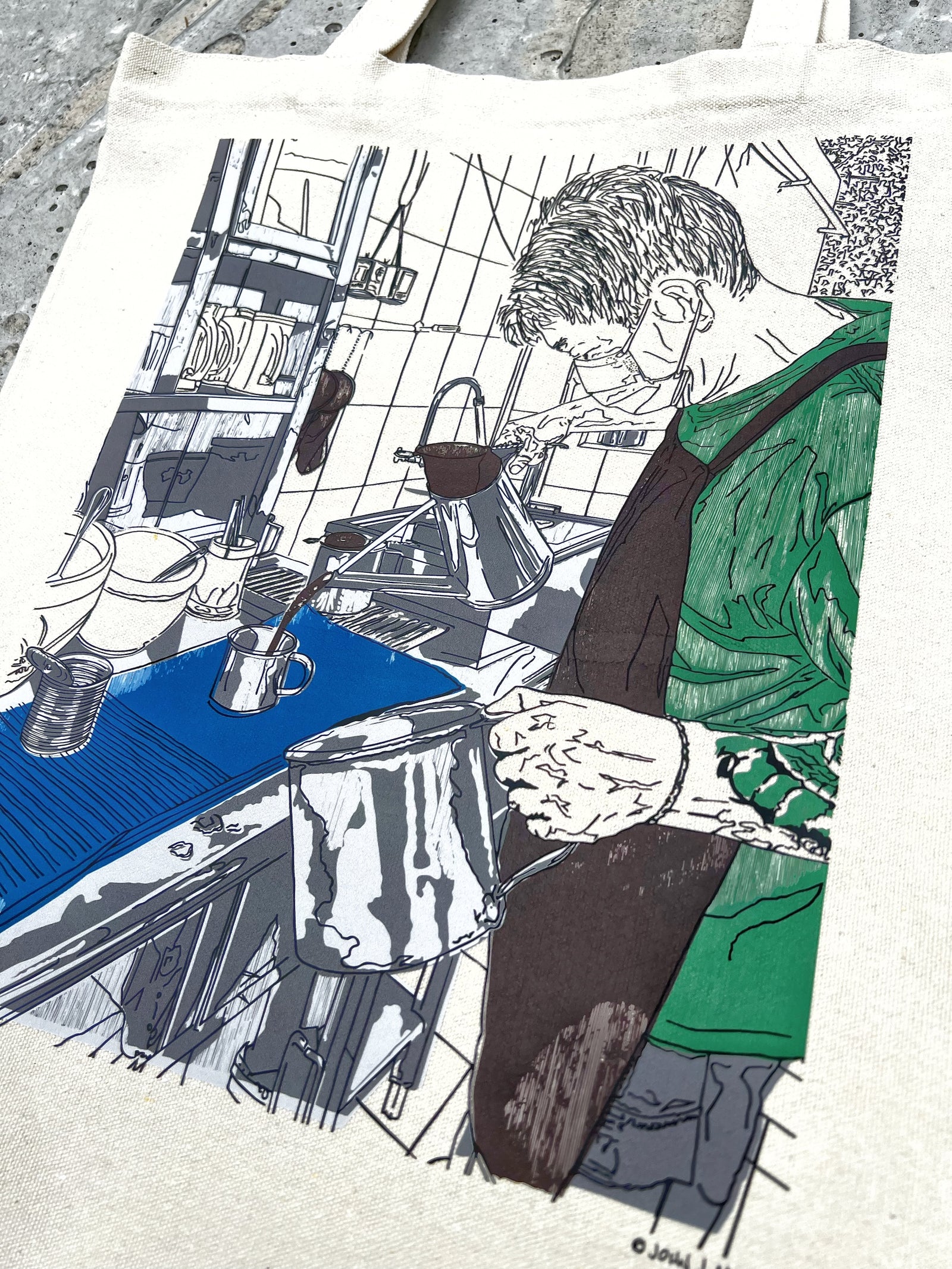 Super functional with a 20×21cm enclosed zip pocket. Heavy canvas with an overall size 48×37cm. The image rides high on the bag so it doesn’t roll under when it’s carrying a load. Comfortable 10”/25cm strap hang.